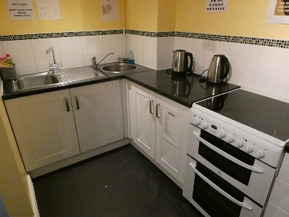 The Kitchen area includes dual sinks, hot and cold water, kettles and a microwave.